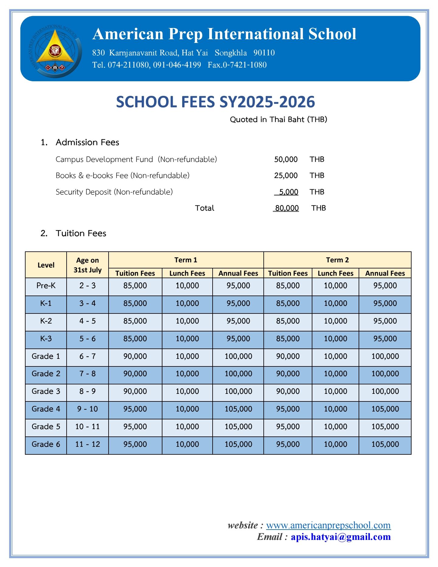 A FINE of 200 Baht per day is charged for late payments of tuition and fees but not to exceed 5000 Baht.